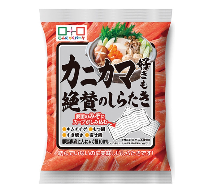 群馬産コンニャク粉を100%使用の、カニかま風の短冊状しらたき。